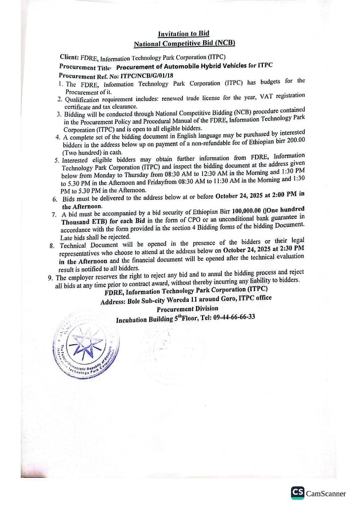 Technology Park Corporation (ITPC) and inspect the bidding document at the address given